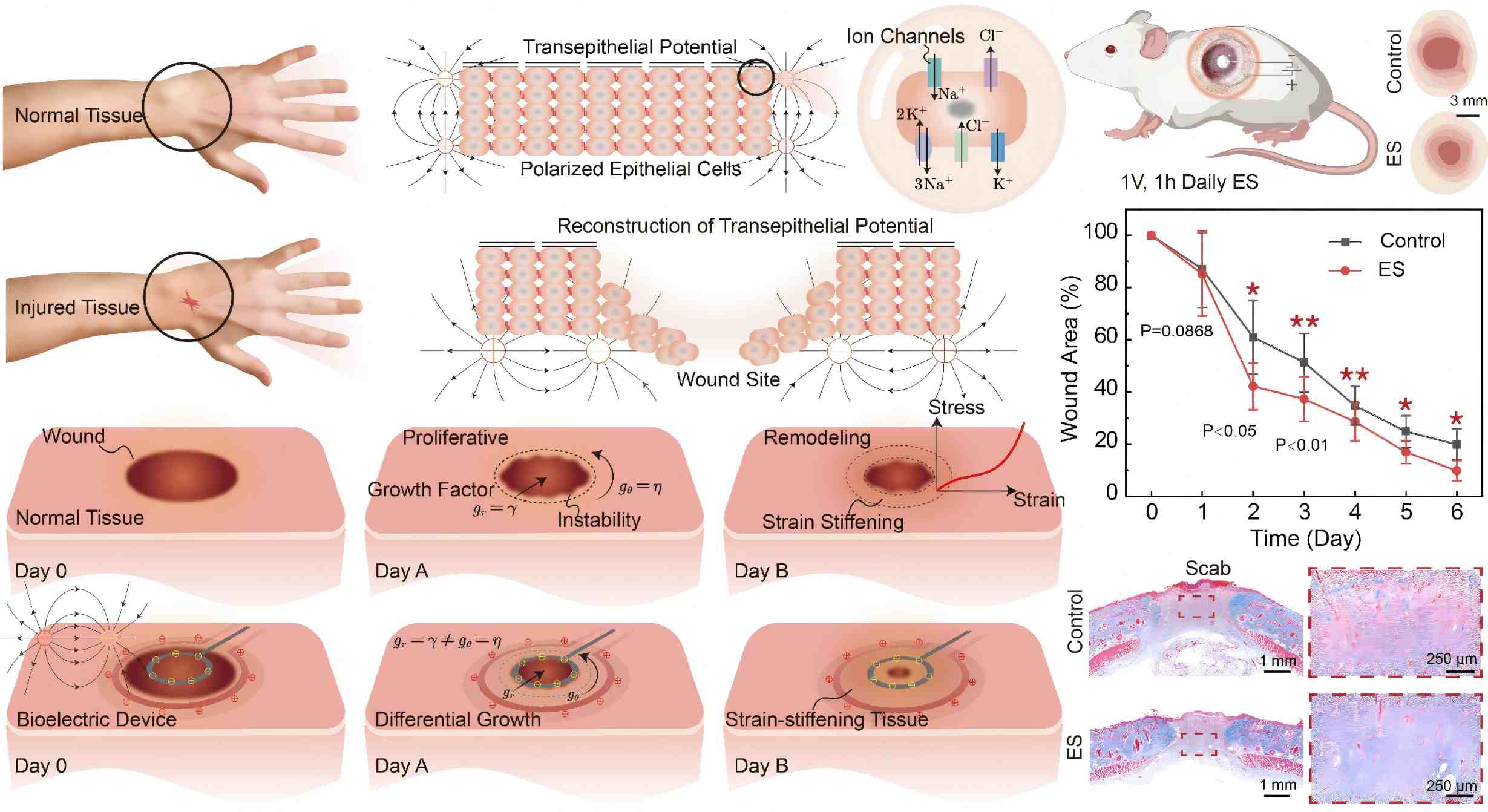 Abstract: Guided by experiments contrasting electrically accelerated recovery with natural healing, this study formulates a model to investigate the importance of electroactive differential growth and morphological changes in tissue repair. It underscores the clinical potential of leveraging electroactive differential growth for improved healing outcomes. The study reveals that voltage stimulation significantly enhances the healing and growth of biological tissues, accelerating the regeneration process across various growth modalities and steering towards isotropic growth conditions that do not favor any specific growth pathways. Enhancing the electroelastic coupling parameters improves the efficacy of bioelectric devices, initiating contraction and fortification of biological tissues in alignment with the electric field. This process facilitates swift cell migration and proliferation, as well as oriented growth of tissue. In instances of strain stiffening at elevated strains, the extreme critical growth ratio aligns with the predictions of neo-Hookean models. Conversely, for tissues experiencing strain stiffening under moderate to very low strain conditions, the strain stiffening effect substantially delays the onset of electroelastic growth instability, ultimately producing a smooth, hyperelastic surface devoid of any unstable morphologies. Our investigation, grounded in nonlinear electroelastic field and perturbation theories, explores how electric fields influence differential growth and instability in biological tissues. We examine the interactions among dimensionless voltage, internal pressure, electroelastic coupling, radius ratio, and strain stiffening, revealing their effects on promoting growth and delaying instability. This framework offers insights into the mechanisms behind electroactive growth and its instabilities, contributing valuable knowledge to the tissue healing.