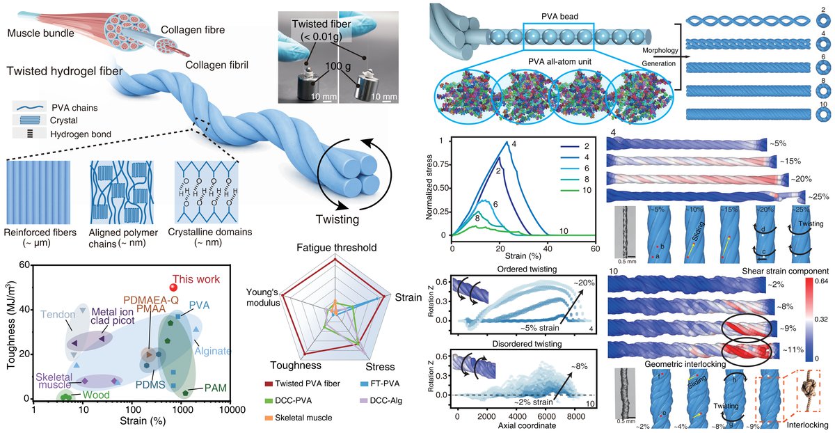 Abstract: Hydrogels hold significant potential for soft robotics and biomedical applications due to their high-water content, tissue-like softness, and biocompatibility, yet their practical utility remains limited by poor fatigue resistance during long-term dynamic loading. Here, we present a twisting strategy that enhances hydrogel materials' mechanical durability through bioinspired torsion methodology, enabling efficient load transfer and energy dissipation. The resulting fibers exhibit improved tensile strength, stretchability, and unprecedented fatigue thresholds while maintaining structural integrity across prolonged cycling. Our strategy is also compatible with various hydrogel systems including poly(vinyl alcohol), alginate, cellulose and corresponding composite systems. This approach benefits from multiscale simulations, revealing that moderate twisting promotes uniform stress distribution through inter-fiber sliding, while excessive twisting causes geometric locking. Proof-of-concept demonstrations include a frog-tongue-inspired actuator showing rapid yet reversible motion under high-frequency cycling, highlighting its exceptional fatigue tolerance. This bioinspired architecture establishes a universal design paradigm for fatigue-resistant hydrogel systems, unlocking their potential in demanding applications from implantable medical devices to adaptive soft robotics.
