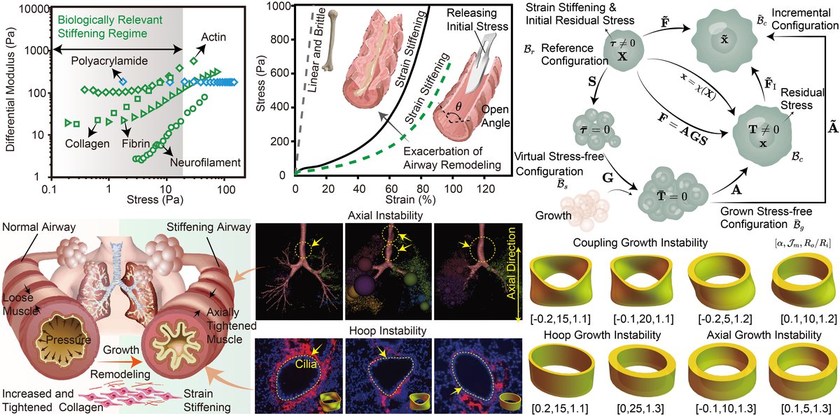 Abstract: Soft biological tissues often exhibit notable strain stiffening under increasing stretch, and this can have significant effects on tissue growth and morphological development, such as causing symmetry breaking in growing airways and leading to mucosal folding and airway hyperresponsiveness. To investigate the role of strain stiffening and the multifactorial control in growth and remodeling, we consider a growing tubular structure with strain-stiffening effects caused by increased and tightened collagen. In addition, we employ the nonlinear hyperelastic Gent model and initial stress symmetry theory to include the coupling effects of differential growth and initial residual stress. Results show that for strain stiffening that takes place at higher strain, the maximum critical growth ratio matches that obtained using neo-Hookean model calculations. Meanwhile, for biological tissues that exhibit strain stiffening under moderate strain conditions, the strain-stiffening effect delays significantly the onset of growth instability. When strain stiffening takes place at very low strains, stiff biological tissues can prevent growth instability, resulting in a smooth hyperelastic cylindrical tubular structure, and the epithelial tissue remains stable at all growth stages without forming any unstable morphology. Our results suggest that strain stiffening can induce retardation instability during biological growth and remodeling, but airway remodeling can incorporate this effect by increasing wall stiffness and reducing obstruction. This highlights the importance of considering the impact of strain stiffening on biological growth and remodeling, which can inform the development of effective clinical interventions for chronic inflammatory airway diseases.