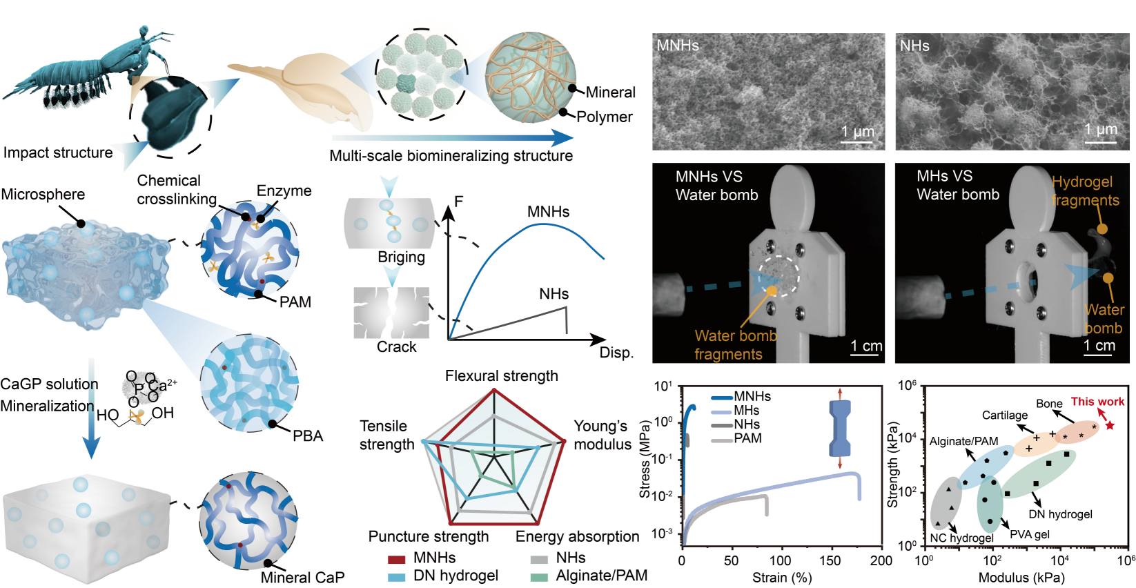 Abstract: The development of extreme impact-resistant materials holds significant importance across engineering applications, yet remains constrained by the inherent trade-offs among mechanical strength, toughness, and energy dissipation efficiency. Drawing inspiration from natural models, particularly the unique structural design and toughening mechanisms of the mantis shrimp's dactyl club, a kind of nanocomposite hydrogel is developed by synergistically integrating polymer elastic microspheres with enzyme-induced biomineralization. This bioinspired approach produces microsphere-reinforced nanocomposite hydrogels (MNHs) that concurrently deliver exceptional strength, remarkable fracture toughness, and unprecedented resistance to ballistic impacts, surpassing the performance of all existing high-strength hydrogels, thus underscoring their potential for protective applications. Nonlinear numerical and theoretical analyses elucidate the dynamic fracture mechanisms governing both quasi-static and high-speed impact scenarios, revealing crack deflection, microcrack nucleation, and energy redistribution as key toughening pathways. This work not only advances the fundamental understanding of bioinspired structural design principles but also establishes a universal blueprint for next-generation impact-resistant materials, unlocking new frontiers for polymer composites in mechanically demanding scenarios.