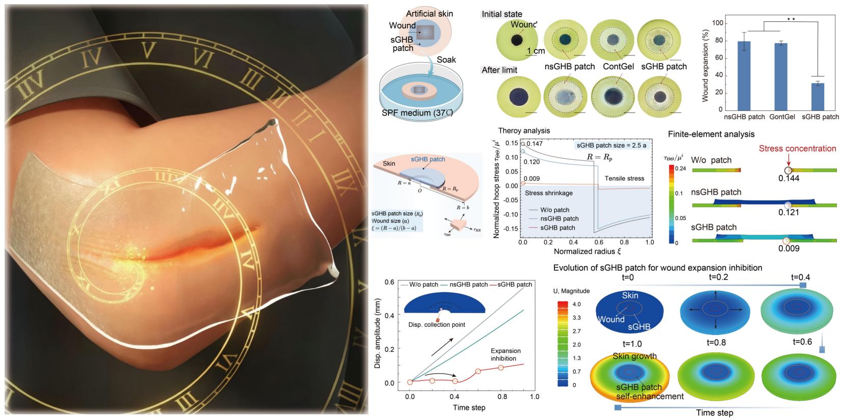 Abstract: Hydrogel bioadhesives have emerged as a promising alternative to wound dressings for chronic wound management. However, many existing bioadhesives do not meet the functional requirements for efficient wound management through dynamically mechanical modulation, due to the reduced wound contractibility, frequent wound recurrence, incapability to actively adapt to external microenvironment variation, especially for those gradually-expanded chronic wounds. Here, a self-growing hydrogel bioadhesive (sGHB) patch that exhibits instant adhesion to biological tissues but also a gradual increase in mechanical strength and interfacial adhesive strength within a 120-h application is presented. The gradually increased mechanics of the sGHB patch could effectively mitigate the stress concentration at the wound edge, and also resist the wound expansion at various stages, thus mechanically contracting the chronic wounds in a programmable manner. The self-growing hydrogel patch demonstrated enhanced wound healing efficacy in a mouse diabetic wound model, by regulating the inflammatory response, promoting the faster re-epithelialization and angiogenesis through mechanical modulation. Such kind of self-growing hydrogel bioadhesives have potential clinical utility for a variety of wound management where dynamic mechanical modulation is indispensable.